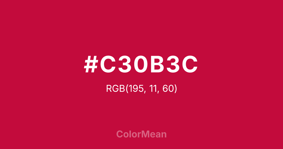 #C30B3C RGB value is (195, 11, 60). The hex color red value is 195, green is 11, and blue is 60. Its HSL format shows a hue of 344°, saturation of 89 percent, and lightness of 40 percent. The CMYK process values are 0 percent, 94 percent, 69 percent, 24 percent.