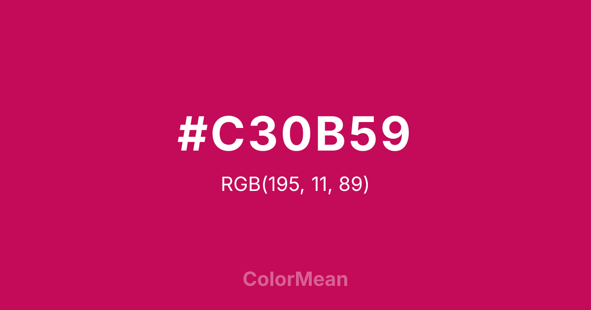 #C30B59 RGB value is (195, 11, 89). The hex color red value is 195, green is 11, and blue is 89. Its HSL format shows a hue of 335°, saturation of 89 percent, and lightness of 40 percent. The CMYK process values are 0 percent, 94 percent, 54 percent, 24 percent.