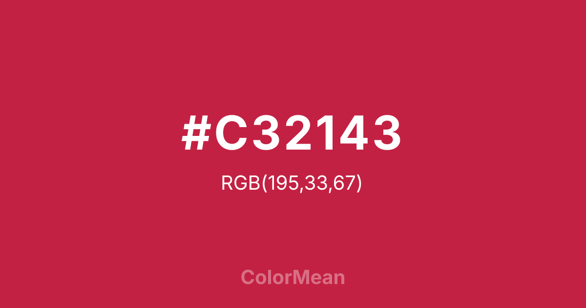 #C32143 RGB value is (195, 33, 67). The hex color red value is 195, green is 33, and blue is 67. Its HSL format shows a hue of 347°, saturation of 71 percent, and lightness of 45 percent. The CMYK process values are 0 percent, 83 percent, 66 percent, 24 percent.