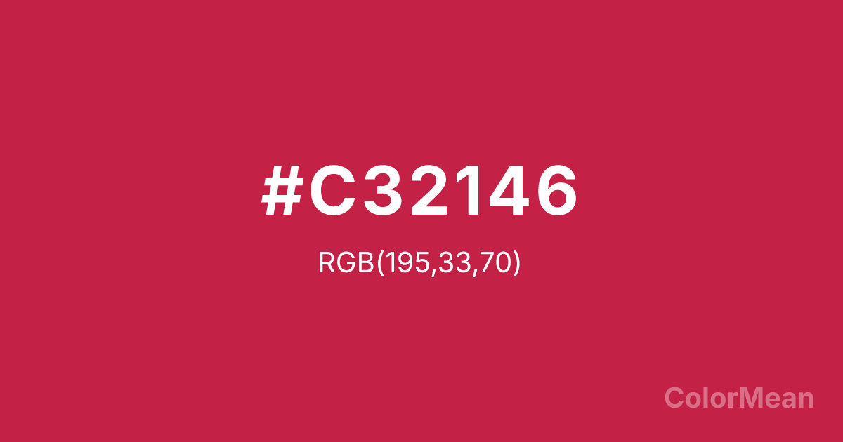 #C32146 RGB value is (195, 33, 70). The hex color red value is 195, green is 33, and blue is 70. Its HSL format shows a hue of 346°, saturation of 71 percent, and lightness of 45 percent. The CMYK process values are 0 percent, 83 percent, 64 percent, 24 percent.