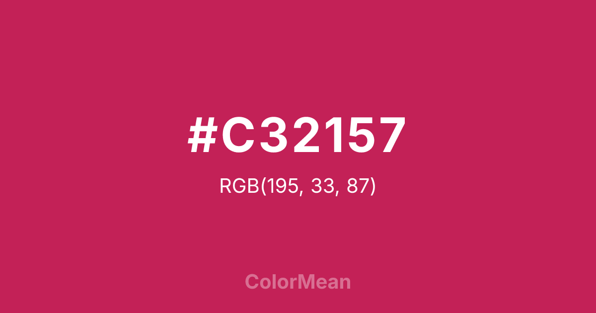 #C32157 RGB value is (195, 33, 87). The hex color red value is 195, green is 33, and blue is 87. Its HSL format shows a hue of 340°, saturation of 71 percent, and lightness of 45 percent. The CMYK process values are 0 percent, 83 percent, 55 percent, 24 percent.