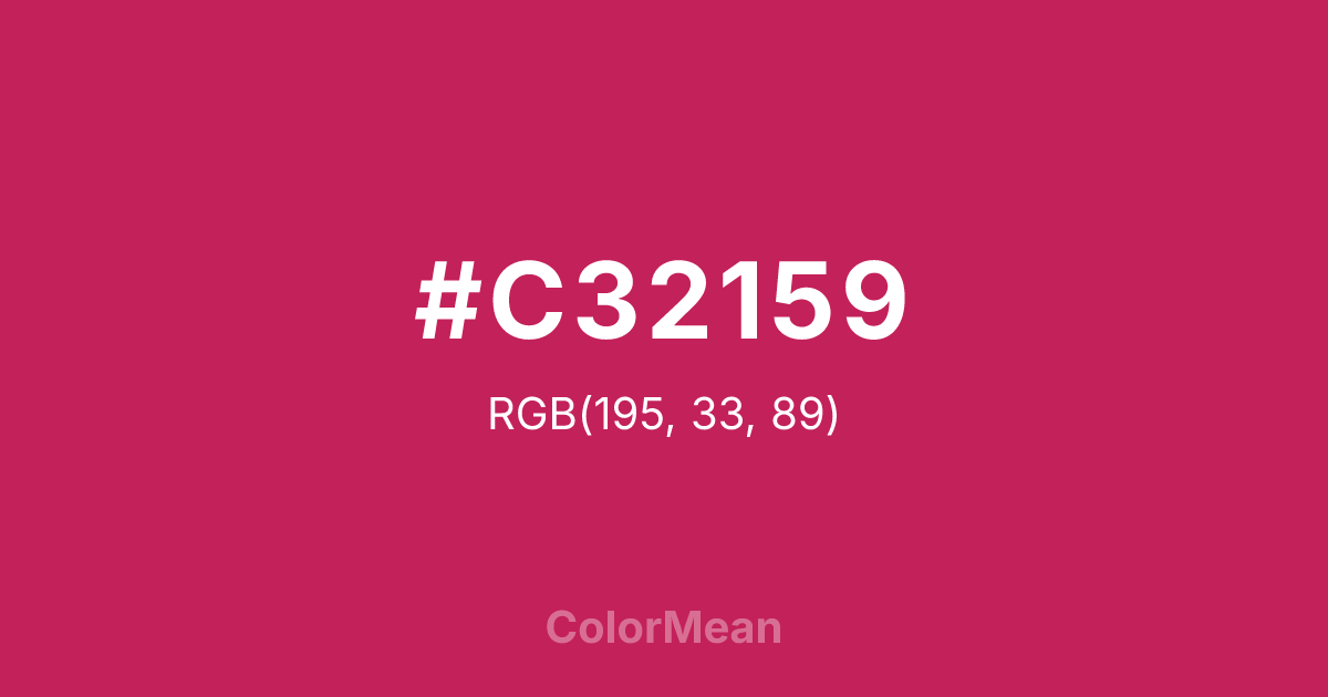 #C32159 RGB value is (195, 33, 89). The hex color red value is 195, green is 33, and blue is 89. Its HSL format shows a hue of 339°, saturation of 71 percent, and lightness of 45 percent. The CMYK process values are 0 percent, 83 percent, 54 percent, 24 percent.