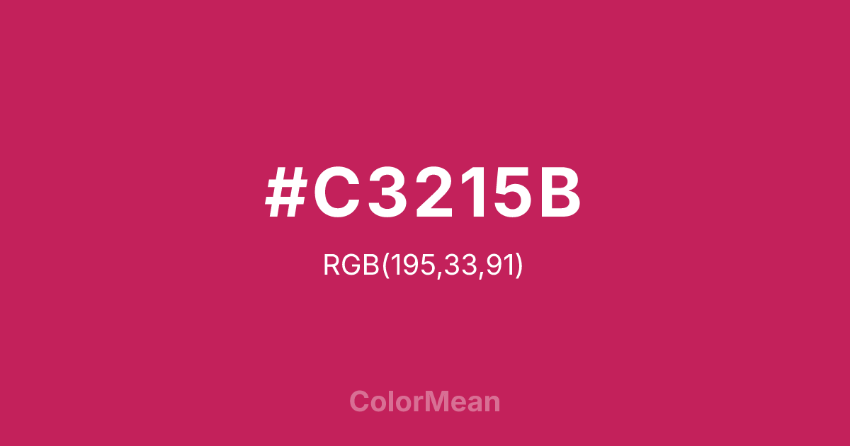 #C3215B RGB value is (195, 33, 91). The hex color red value is 195, green is 33, and blue is 91. Its HSL format shows a hue of 339°, saturation of 71 percent, and lightness of 45 percent. The CMYK process values are 0 percent, 83 percent, 53 percent, 24 percent.
