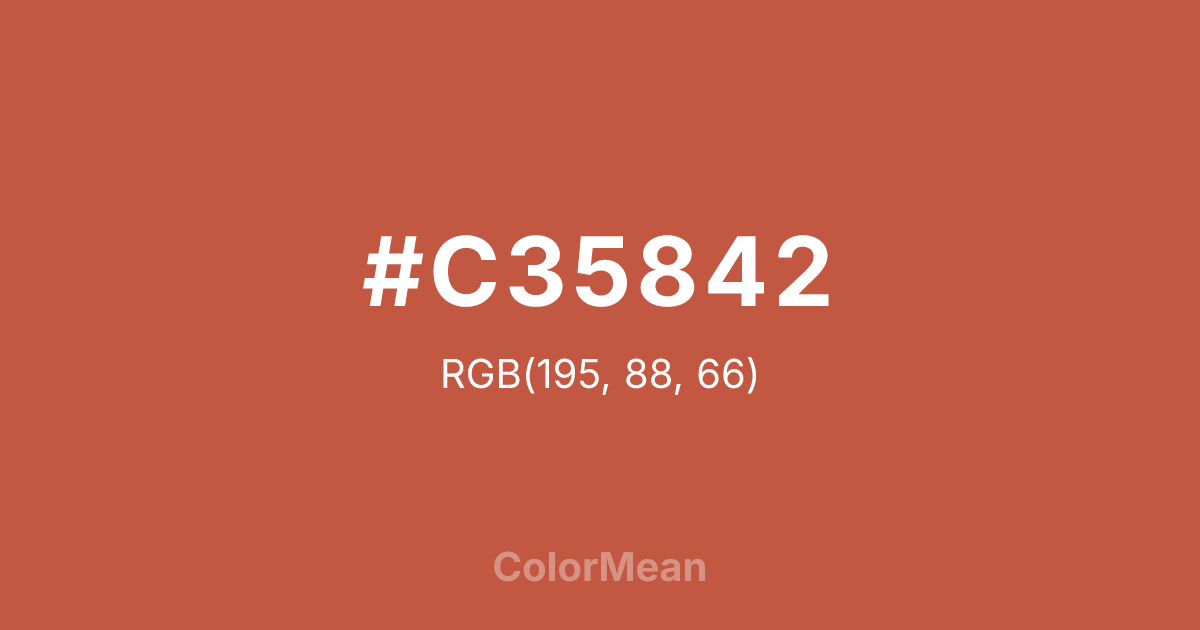 #C35842 RGB value is (195, 88, 66). The hex color red value is 195, green is 88, and blue is 66. Its HSL format shows a hue of 10°, saturation of 52 percent, and lightness of 51 percent. The CMYK process values are 0 percent, 55 percent, 66 percent, 24 percent.