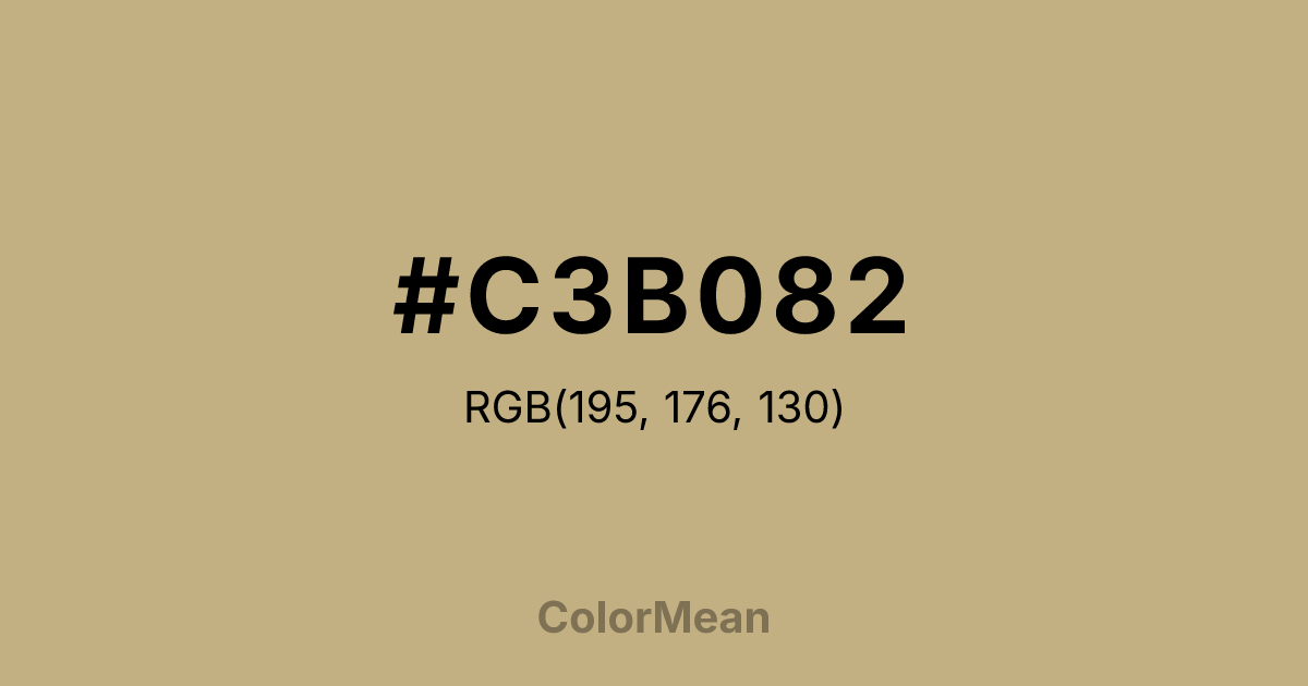 #C3B082 RGB value is (195, 176, 130). The hex color red value is 195, green is 176, and blue is 130. Its HSL format shows a hue of 42°, saturation of 35 percent, and lightness of 64 percent. The CMYK process values are 0 percent, 10 percent, 33 percent, 24 percent.