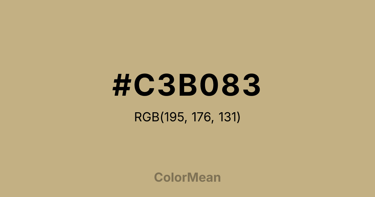 #C3B083 RGB value is (195, 176, 131). The hex color red value is 195, green is 176, and blue is 131. Its HSL format shows a hue of 42°, saturation of 35 percent, and lightness of 64 percent. The CMYK process values are 0 percent, 10 percent, 33 percent, 24 percent.