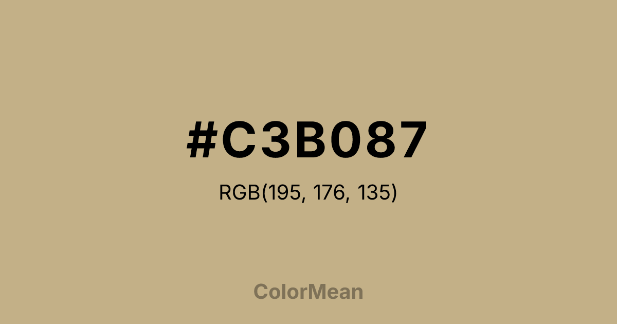 #C3B087 RGB value is (195, 176, 135). The hex color red value is 195, green is 176, and blue is 135. Its HSL format shows a hue of 41°, saturation of 33 percent, and lightness of 65 percent. The CMYK process values are 0 percent, 10 percent, 31 percent, 24 percent.