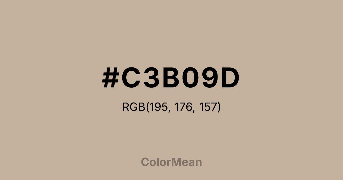 #C3B09D RGB value is (195, 176, 157). The hex color red value is 195, green is 176, and blue is 157. Its HSL format shows a hue of 30°, saturation of 24 percent, and lightness of 69 percent. The CMYK process values are 0 percent, 10 percent, 19 percent, 24 percent.