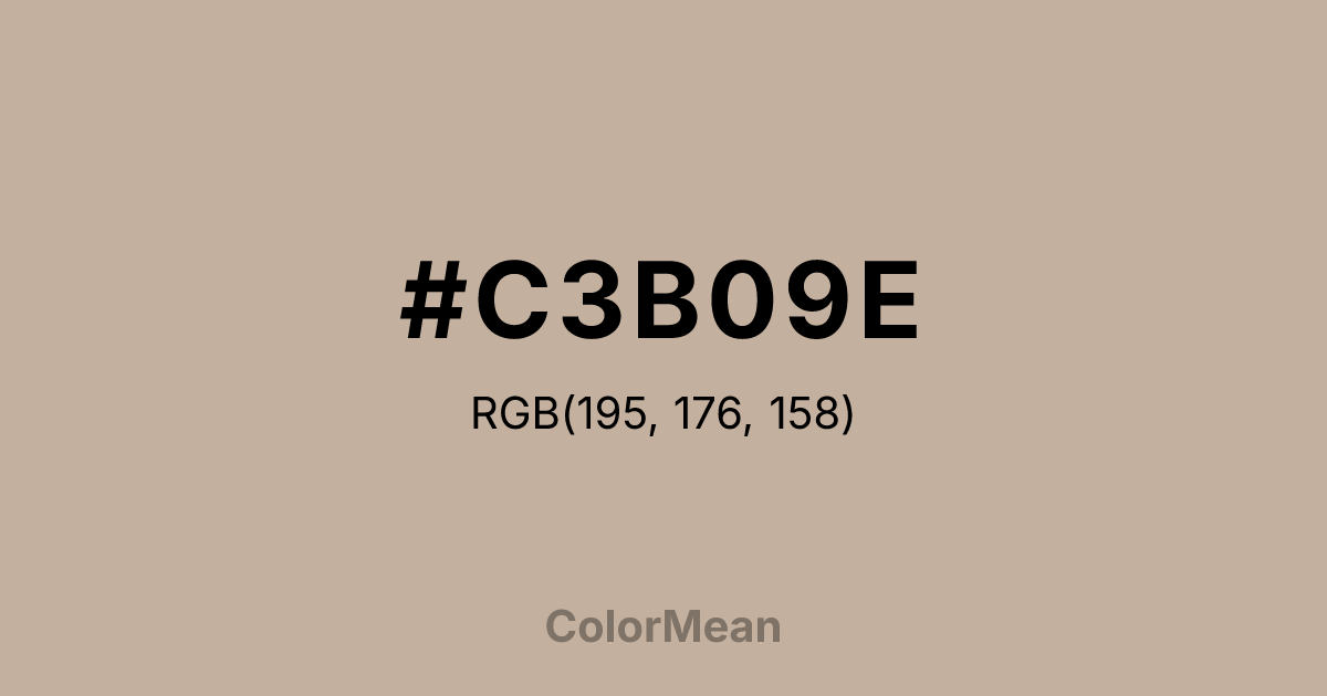 #C3B09E RGB value is (195, 176, 158). The hex color red value is 195, green is 176, and blue is 158. Its HSL format shows a hue of 29°, saturation of 24 percent, and lightness of 69 percent. The CMYK process values are 0 percent, 10 percent, 19 percent, 24 percent.