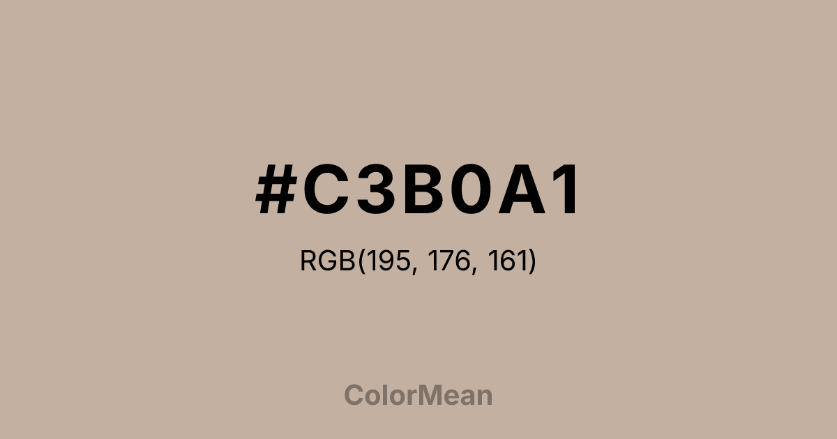 #C3B0A1 RGB value is (195, 176, 161). The hex color red value is 195, green is 176, and blue is 161. Its HSL format shows a hue of 26°, saturation of 22 percent, and lightness of 70 percent. The CMYK process values are 0 percent, 10 percent, 17 percent, 24 percent.