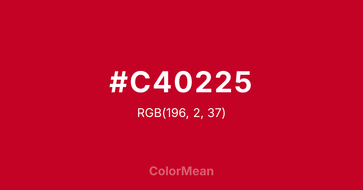 #C40225 RGB value is (196, 2, 37). The hex color red value is 196, green is 2, and blue is 37. Its HSL format shows a hue of 349°, saturation of 98 percent, and lightness of 39 percent. The CMYK process values are 0 percent, 99 percent, 81 percent, 23 percent.