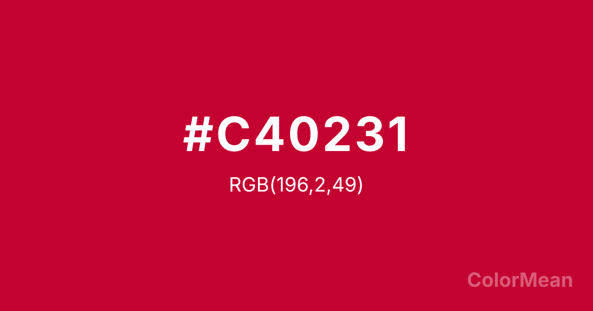 #C40231 RGB value is (196, 2, 49). The hex color red value is 196, green is 2, and blue is 49. Its HSL format shows a hue of 345°, saturation of 98 percent, and lightness of 39 percent. The CMYK process values are 0 percent, 99 percent, 75 percent, 23 percent.