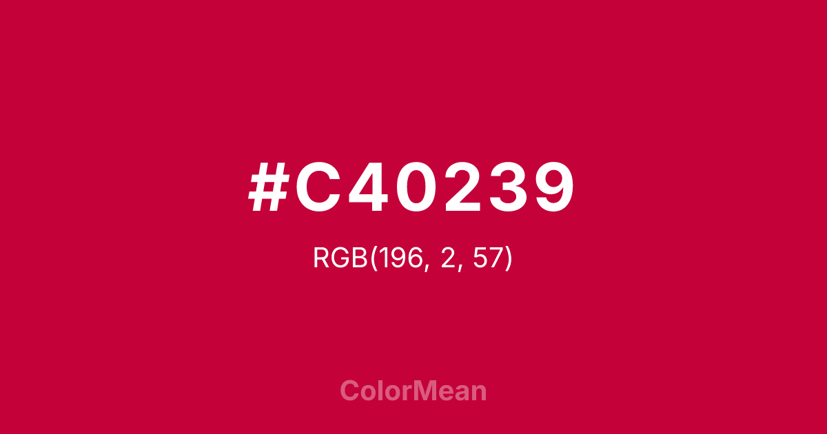 #C40239 RGB value is (196, 2, 57). The hex color red value is 196, green is 2, and blue is 57. Its HSL format shows a hue of 343°, saturation of 98 percent, and lightness of 39 percent. The CMYK process values are 0 percent, 99 percent, 71 percent, 23 percent.
