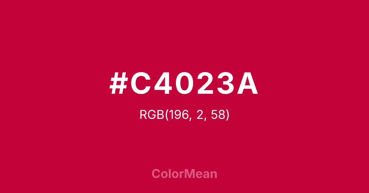 #C4023A RGB value is (196, 2, 58). The hex color red value is 196, green is 2, and blue is 58. Its HSL format shows a hue of 343°, saturation of 98 percent, and lightness of 39 percent. The CMYK process values are 0 percent, 99 percent, 70 percent, 23 percent.