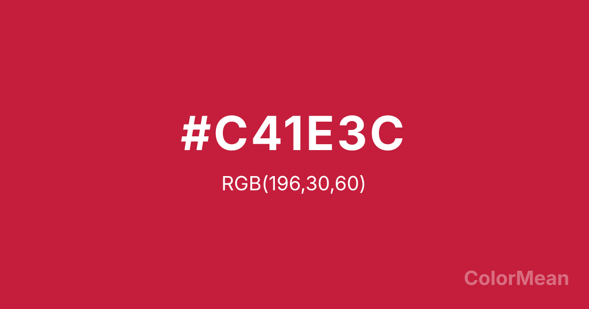 #C41E3C RGB value is (196, 30, 60). The hex color red value is 196, green is 30, and blue is 60. Its HSL format shows a hue of 349°, saturation of 73 percent, and lightness of 44 percent. The CMYK process values are 0 percent, 85 percent, 69 percent, 23 percent.