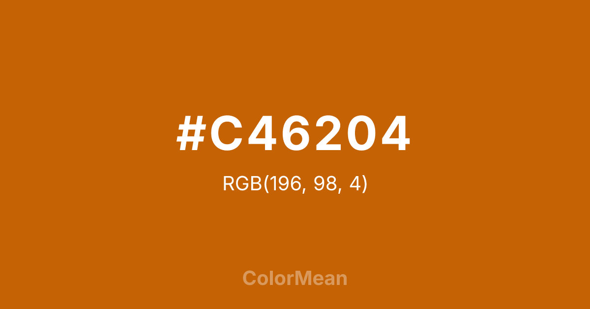 #C46204 RGB value is (196, 98, 4). The hex color red value is 196, green is 98, and blue is 4. Its HSL format shows a hue of 29°, saturation of 96 percent, and lightness of 39 percent. The CMYK process values are 0 percent, 50 percent, 98 percent, 23 percent.