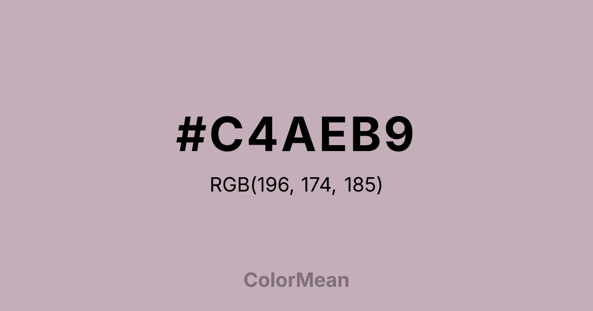 #C4AEB9 RGB value is (196, 174, 185). The hex color red value is 196, green is 174, and blue is 185. Its HSL format shows a hue of 330°, saturation of 16 percent, and lightness of 73 percent. The CMYK process values are 0 percent, 11 percent, 6 percent, 23 percent.