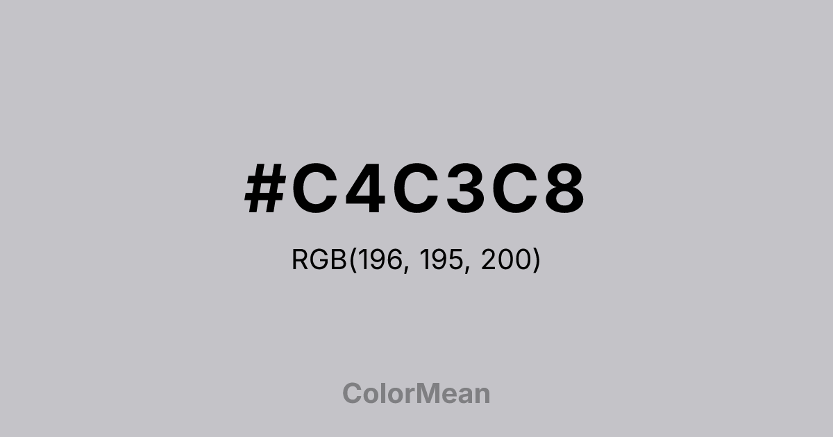 #C4C3C8 RGB value is (196, 195, 200). The hex color red value is 196, green is 195, and blue is 200. Its HSL format shows a hue of 252°, saturation of 4 percent, and lightness of 77 percent. The CMYK process values are 2 percent, 3 percent, 0 percent, 22 percent.