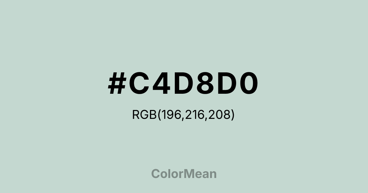 #C4D8D0 RGB value is (196, 216, 208). The hex color red value is 196, green is 216, and blue is 208. Its HSL format shows a hue of 156°, saturation of 20 percent, and lightness of 81 percent. The CMYK process values are 9 percent, 0 percent, 4 percent, 15 percent.