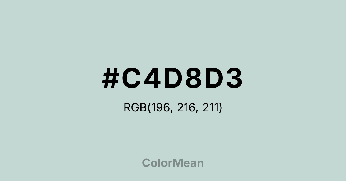 #C4D8D3 RGB value is (196, 216, 211). The hex color red value is 196, green is 216, and blue is 211. Its HSL format shows a hue of 165°, saturation of 20 percent, and lightness of 81 percent. The CMYK process values are 9 percent, 0 percent, 2 percent, 15 percent.