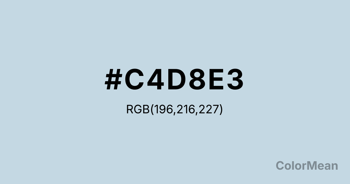 #C4D8E3 RGB value is (196, 216, 227). The hex color red value is 196, green is 216, and blue is 227. Its HSL format shows a hue of 201°, saturation of 36 percent, and lightness of 83 percent. The CMYK process values are 14 percent, 5 percent, 0 percent, 11 percent.