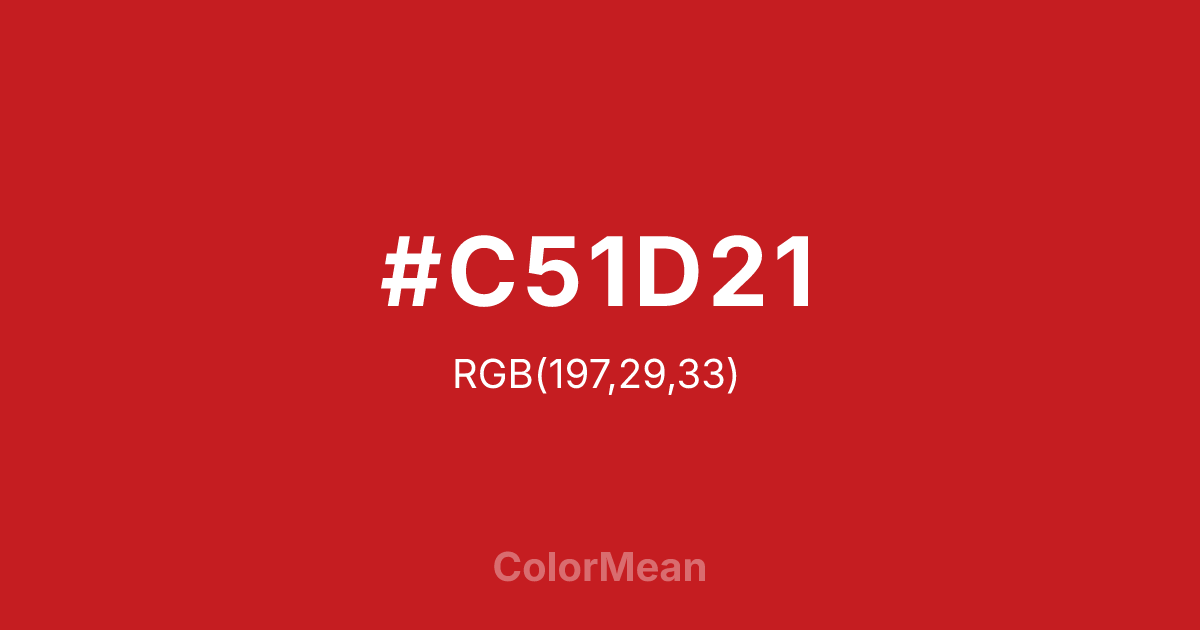 #C51D21 RGB value is (197, 29, 33). The hex color red value is 197, green is 29, and blue is 33. Its HSL format shows a hue of 359°, saturation of 74 percent, and lightness of 44 percent. The CMYK process values are 0 percent, 85 percent, 83 percent, 23 percent.
