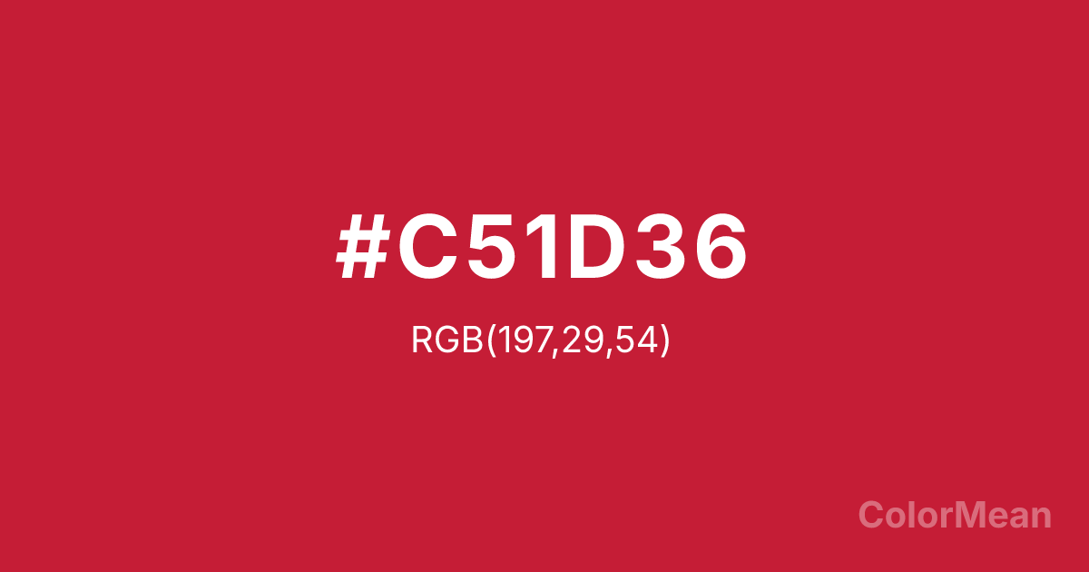 #C51D36 RGB value is (197, 29, 54). The hex color red value is 197, green is 29, and blue is 54. Its HSL format shows a hue of 351°, saturation of 74 percent, and lightness of 44 percent. The CMYK process values are 0 percent, 85 percent, 73 percent, 23 percent.