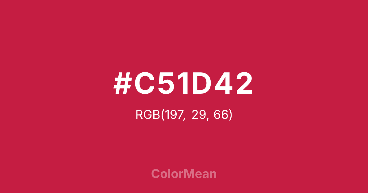 #C51D42 RGB value is (197, 29, 66). The hex color red value is 197, green is 29, and blue is 66. Its HSL format shows a hue of 347°, saturation of 74 percent, and lightness of 44 percent. The CMYK process values are 0 percent, 85 percent, 66 percent, 23 percent.