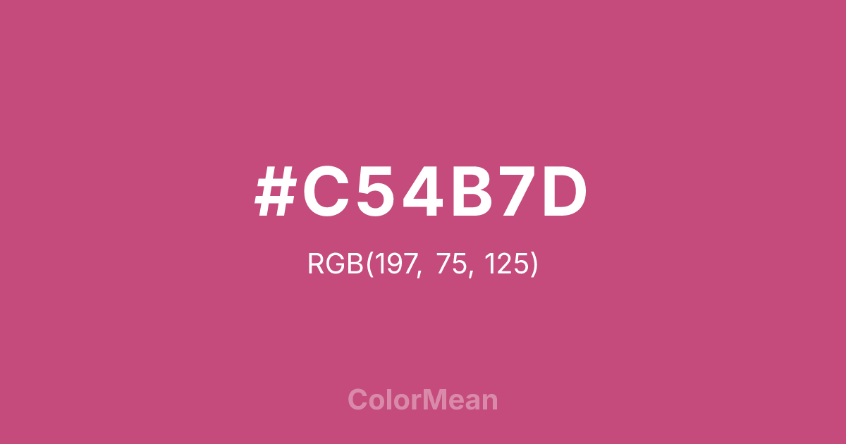 #C54B7D RGB value is (197, 75, 125). The hex color red value is 197, green is 75, and blue is 125. Its HSL format shows a hue of 335°, saturation of 51 percent, and lightness of 53 percent. The CMYK process values are 0 percent, 62 percent, 37 percent, 23 percent.