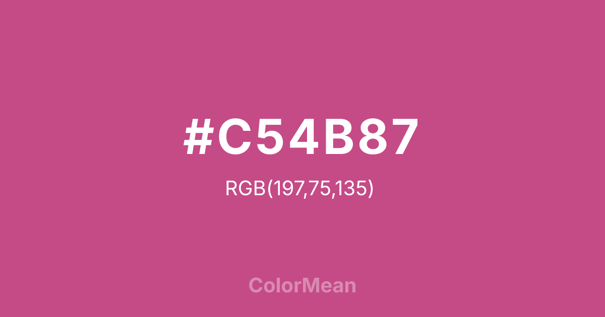 #C54B87 RGB value is (197, 75, 135). The hex color red value is 197, green is 75, and blue is 135. Its HSL format shows a hue of 330°, saturation of 51 percent, and lightness of 53 percent. The CMYK process values are 0 percent, 62 percent, 31 percent, 23 percent.