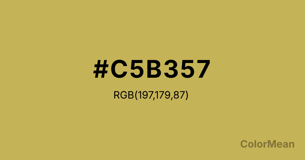 #C5B357 RGB value is (197, 179, 87). The hex color red value is 197, green is 179, and blue is 87. Its HSL format shows a hue of 50°, saturation of 49 percent, and lightness of 56 percent. The CMYK process values are 0 percent, 9 percent, 56 percent, 23 percent.