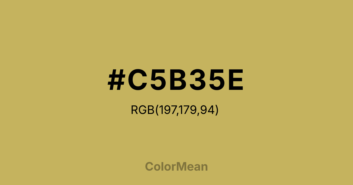 #C5B35E RGB value is (197, 179, 94). The hex color red value is 197, green is 179, and blue is 94. Its HSL format shows a hue of 50°, saturation of 47 percent, and lightness of 57 percent. The CMYK process values are 0 percent, 9 percent, 52 percent, 23 percent.