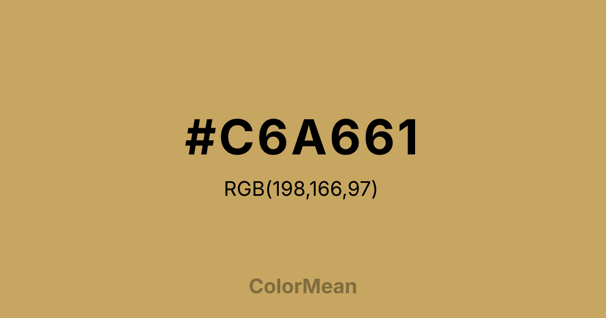 #C6A661 RGB value is (198, 166, 97). The hex color red value is 198, green is 166, and blue is 97. Its HSL format shows a hue of 41°, saturation of 47 percent, and lightness of 58 percent. The CMYK process values are 0 percent, 16 percent, 51 percent, 22 percent.
