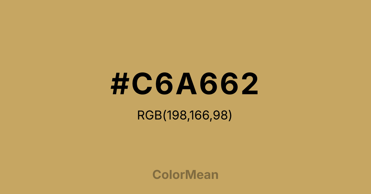 #C6A662 RGB value is (198, 166, 98). The hex color red value is 198, green is 166, and blue is 98. Its HSL format shows a hue of 41°, saturation of 47 percent, and lightness of 58 percent. The CMYK process values are 0 percent, 16 percent, 51 percent, 22 percent.