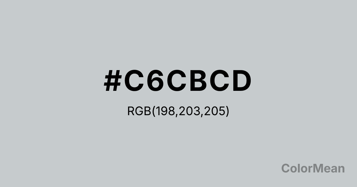 #C6CBCD RGB value is (198, 203, 205). The hex color red value is 198, green is 203, and blue is 205. Its HSL format shows a hue of 197°, saturation of 7 percent, and lightness of 79 percent. The CMYK process values are 3 percent, 1 percent, 0 percent, 20 percent.