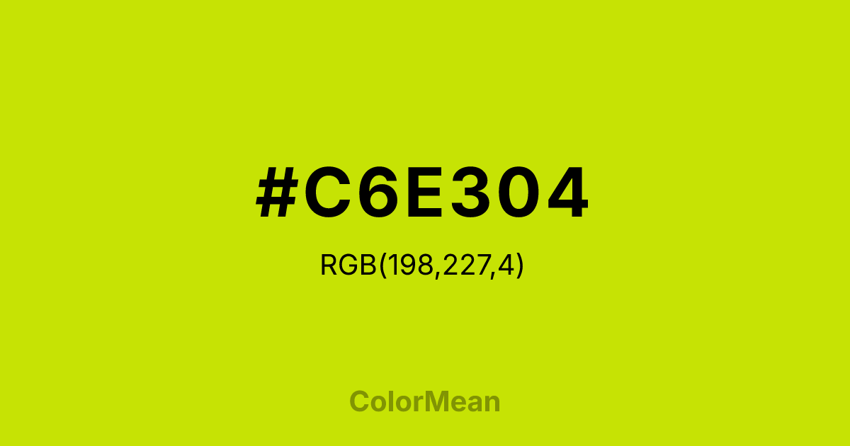 #C6E304 RGB value is (198, 227, 4). The hex color red value is 198, green is 227, and blue is 4. Its HSL format shows a hue of 68°, saturation of 97 percent, and lightness of 45 percent. The CMYK process values are 13 percent, 0 percent, 98 percent, 11 percent.
