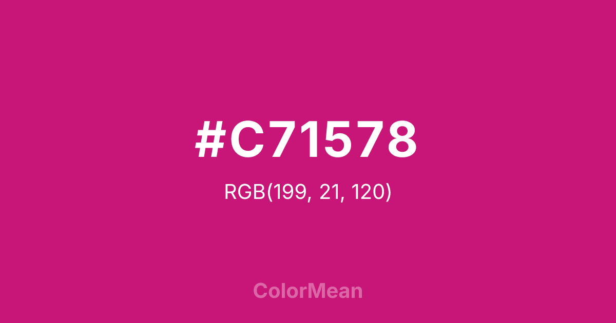 #C71578 RGB value is (199, 21, 120). The hex color red value is 199, green is 21, and blue is 120. Its HSL format shows a hue of 327°, saturation of 81 percent, and lightness of 43 percent. The CMYK process values are 0 percent, 89 percent, 40 percent, 22 percent.