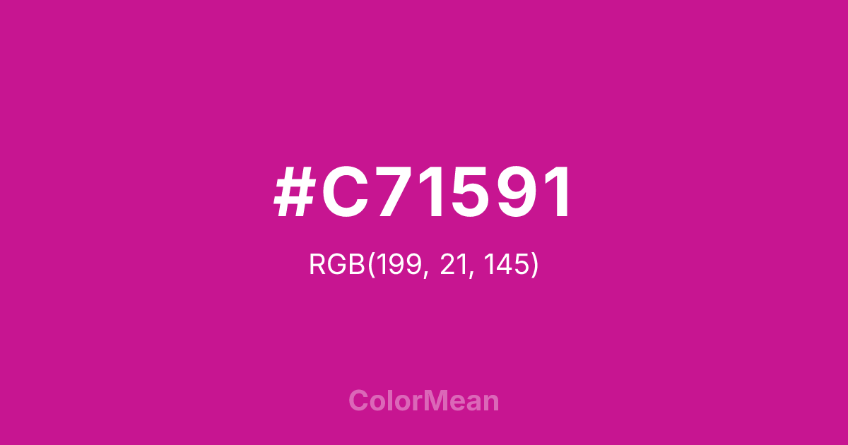 #C71591 RGB value is (199, 21, 145). The hex color red value is 199, green is 21, and blue is 145. Its HSL format shows a hue of 318°, saturation of 81 percent, and lightness of 43 percent. The CMYK process values are 0 percent, 89 percent, 27 percent, 22 percent.