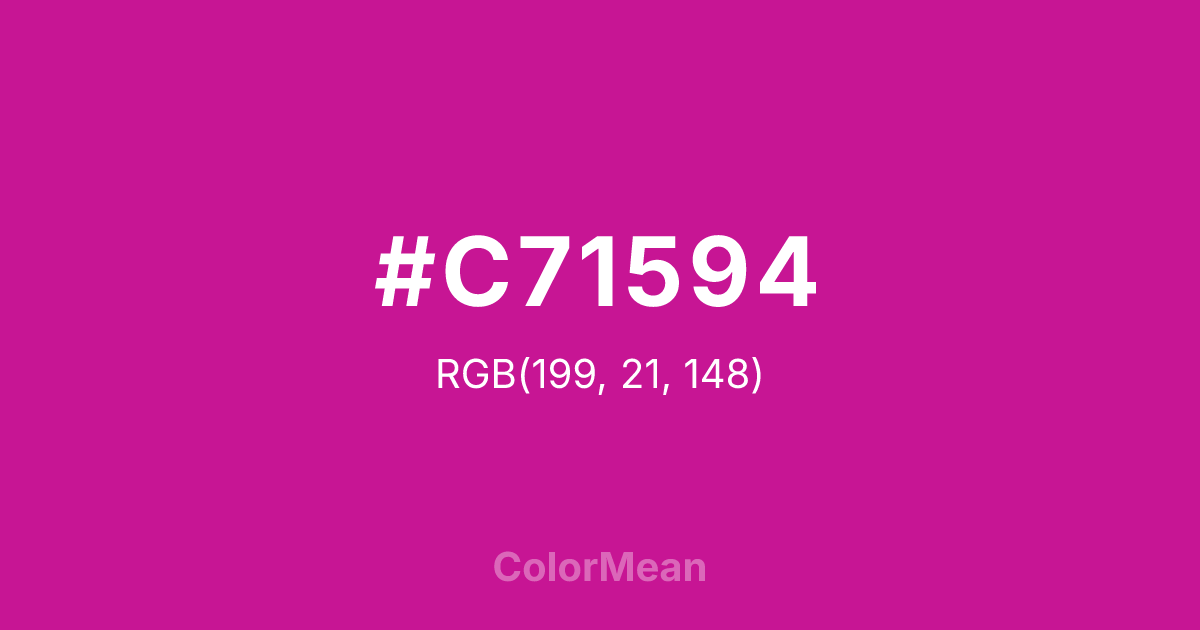 #C71594 RGB value is (199, 21, 148). The hex color red value is 199, green is 21, and blue is 148. Its HSL format shows a hue of 317°, saturation of 81 percent, and lightness of 43 percent. The CMYK process values are 0 percent, 89 percent, 26 percent, 22 percent.