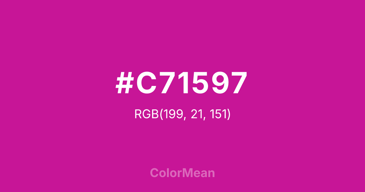 #C71597 RGB value is (199, 21, 151). The hex color red value is 199, green is 21, and blue is 151. Its HSL format shows a hue of 316°, saturation of 81 percent, and lightness of 43 percent. The CMYK process values are 0 percent, 89 percent, 24 percent, 22 percent.