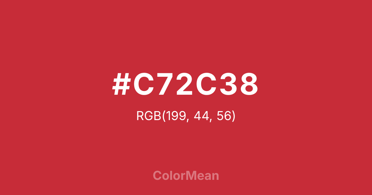 #C72C38 RGB value is (199, 44, 56). The hex color red value is 199, green is 44, and blue is 56. Its HSL format shows a hue of 355°, saturation of 64 percent, and lightness of 48 percent. The CMYK process values are 0 percent, 78 percent, 72 percent, 22 percent.
