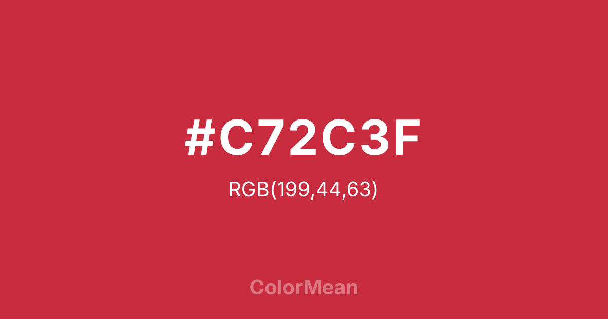 #C72C3F RGB value is (199, 44, 63). The hex color red value is 199, green is 44, and blue is 63. Its HSL format shows a hue of 353°, saturation of 64 percent, and lightness of 48 percent. The CMYK process values are 0 percent, 78 percent, 68 percent, 22 percent.