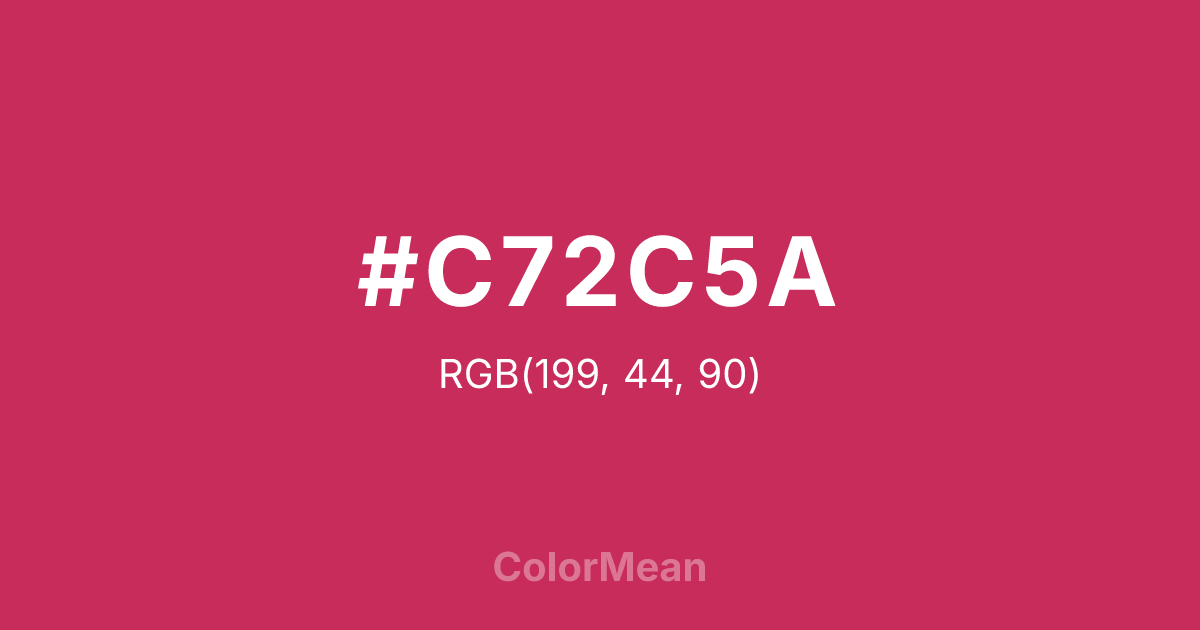 #C72C5A RGB value is (199, 44, 90). The hex color red value is 199, green is 44, and blue is 90. Its HSL format shows a hue of 342°, saturation of 64 percent, and lightness of 48 percent. The CMYK process values are 0 percent, 78 percent, 55 percent, 22 percent.