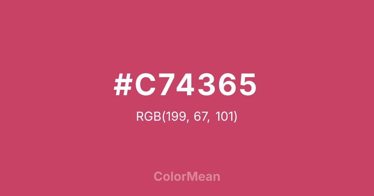 #C74365 RGB value is (199, 67, 101). The hex color red value is 199, green is 67, and blue is 101. Its HSL format shows a hue of 345°, saturation of 54 percent, and lightness of 52 percent. The CMYK process values are 0 percent, 66 percent, 49 percent, 22 percent.