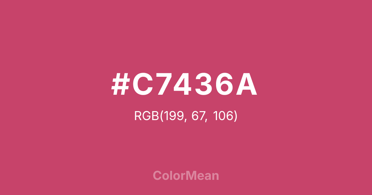 #C7436A RGB value is (199, 67, 106). The hex color red value is 199, green is 67, and blue is 106. Its HSL format shows a hue of 342°, saturation of 54 percent, and lightness of 52 percent. The CMYK process values are 0 percent, 66 percent, 47 percent, 22 percent.