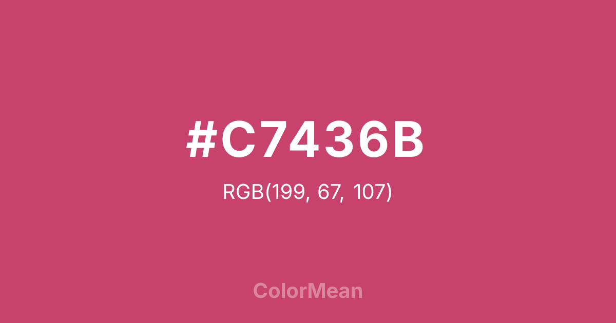 #C7436B RGB value is (199, 67, 107). The hex color red value is 199, green is 67, and blue is 107. Its HSL format shows a hue of 342°, saturation of 54 percent, and lightness of 52 percent. The CMYK process values are 0 percent, 66 percent, 46 percent, 22 percent.