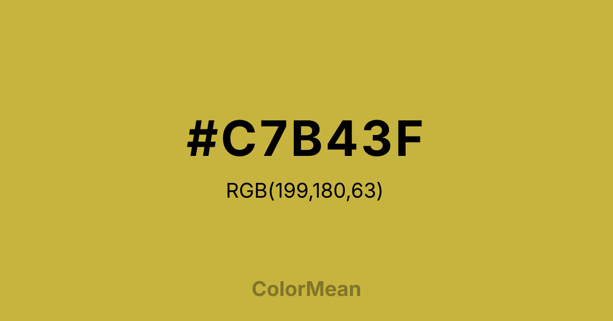 #C7B43F RGB value is (199, 180, 63). The hex color red value is 199, green is 180, and blue is 63. Its HSL format shows a hue of 52°, saturation of 55 percent, and lightness of 51 percent. The CMYK process values are 0 percent, 10 percent, 68 percent, 22 percent.
