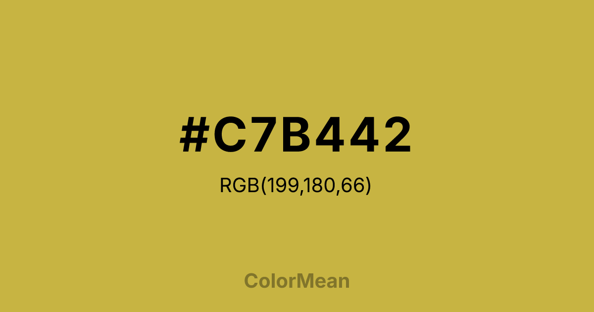 #C7B442 RGB value is (199, 180, 66). The hex color red value is 199, green is 180, and blue is 66. Its HSL format shows a hue of 51°, saturation of 54 percent, and lightness of 52 percent. The CMYK process values are 0 percent, 10 percent, 67 percent, 22 percent.