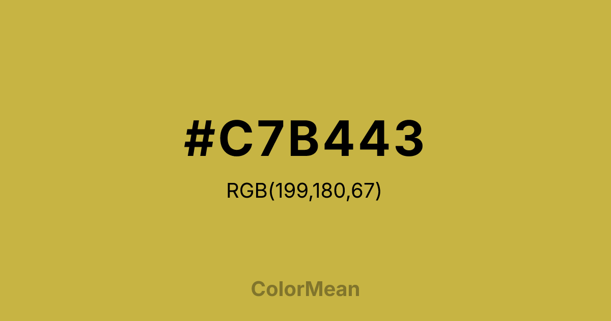 #C7B443 RGB value is (199, 180, 67). The hex color red value is 199, green is 180, and blue is 67. Its HSL format shows a hue of 51°, saturation of 54 percent, and lightness of 52 percent. The CMYK process values are 0 percent, 10 percent, 66 percent, 22 percent.
