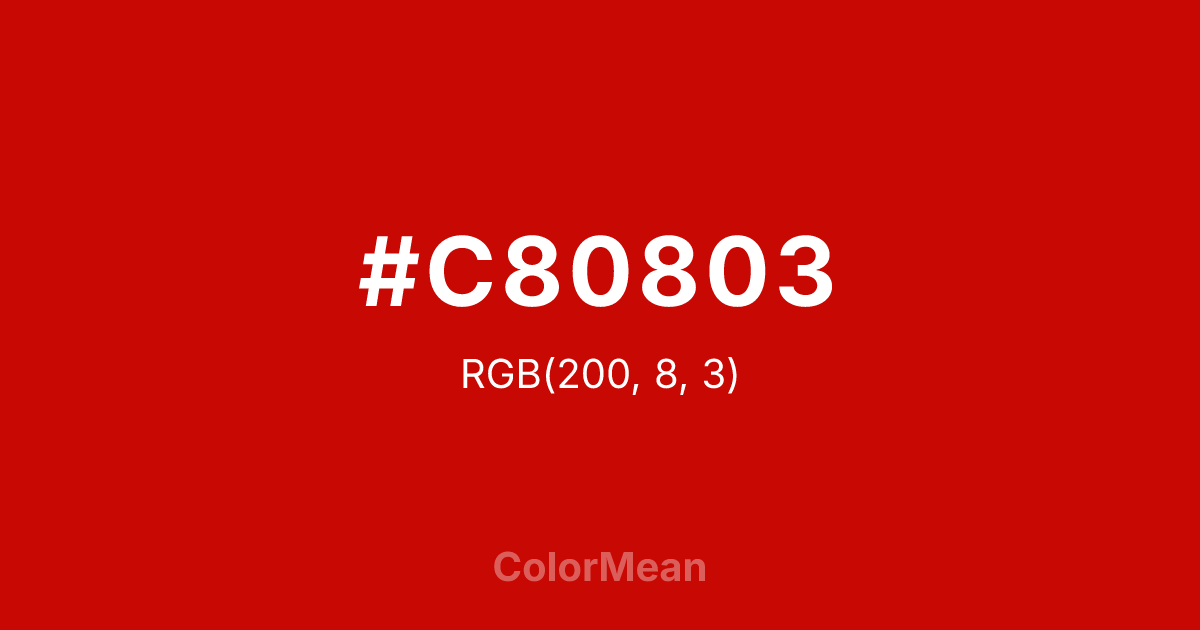 #C80803 RGB value is (200, 8, 3). The hex color red value is 200, green is 8, and blue is 3. Its HSL format shows a hue of 2°, saturation of 97 percent, and lightness of 40 percent. The CMYK process values are 0 percent, 96 percent, 99 percent, 22 percent.